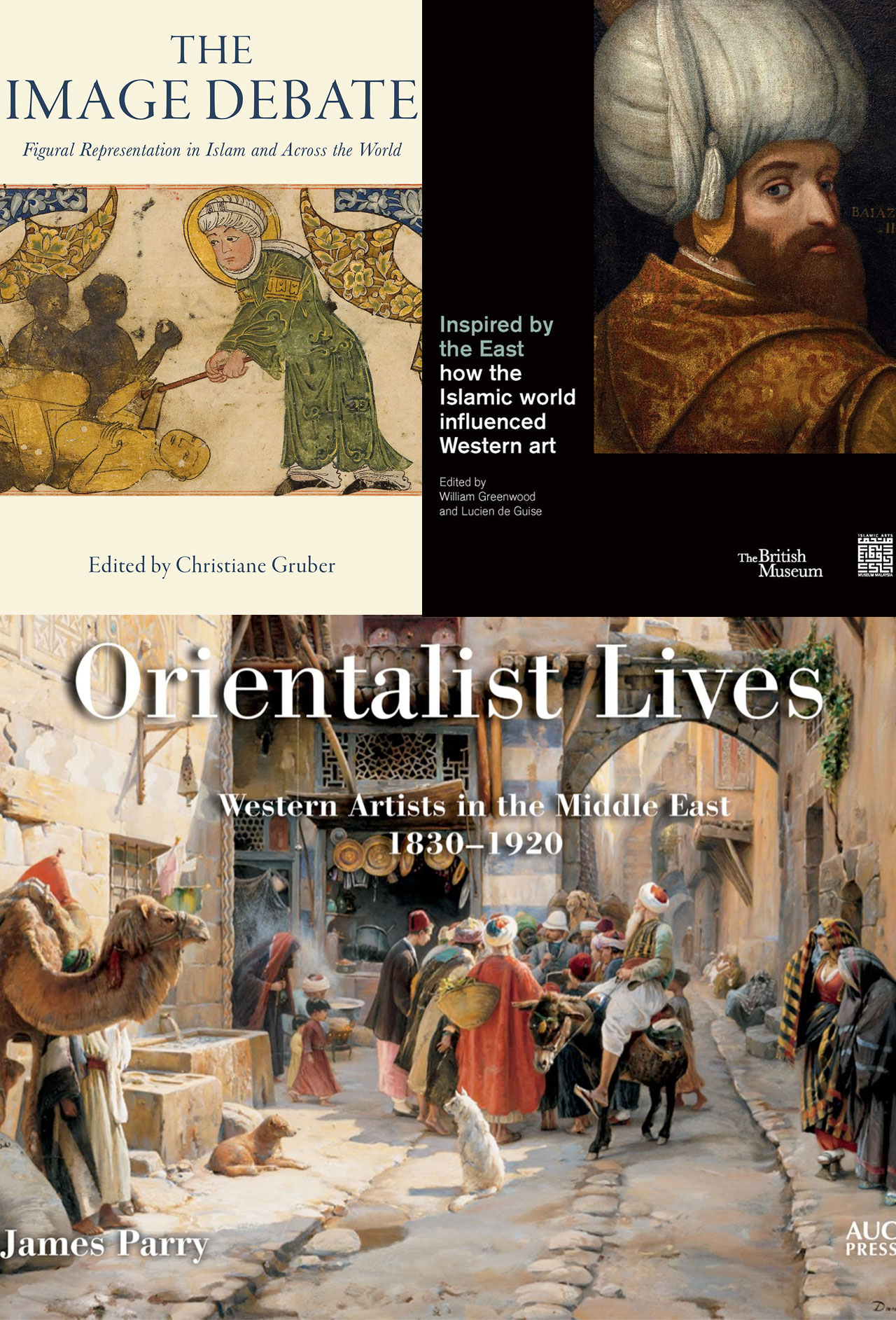 INSPIRED BY THE EAST: HOW THE ISLAMIC WORLD INFLUENCED WESTERN ART, edited by William Greenwood and Lucien de Guise. London: British Museum, 2019. Pp. 256. ISBN: 9780714111933. THE IMAGE DEBATE: FIGURAL REPRESENTATION IN ISLAM AND ACROSS THE WORLD, edited by Christiane Gruber. London: Ginko, 2019. Pp. 240. ISBN: 9781909942349. ORIENTALIST LIVES: WESTERN ARTISTS IN THE MIDDLE EAST 1830–1920, by James Parry. Cairo & New York: The American University in Cairo Press, 2018. Pp. 294. ISBN: 9789774168352. Who has travelled to North Africa or the Middle East and not been entranced by meandering in the alleyways of a Medina, eyes roving around a bewildering array of merchandise with their instant evocations of eastern mysteries and promises? Even though most of the crafts are no longer entirely made by hand using local materials, the colours, smells and styles are still enticing enough to warrant a protracted bargaining session with the vendor.